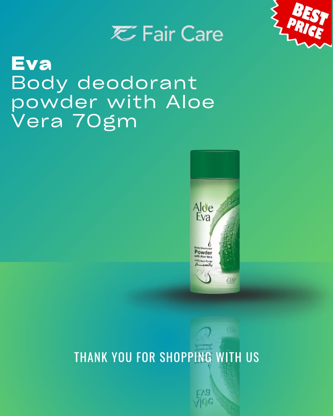 Aloe Eva Body Deodorant Powder With Aloe Vera 70g.. مفعول الصبار الملطف وامتصاص الرطوبة الفائق لمنح جسمكِ انتعاشاً دائماً وملمساً حريرياً بفعالية