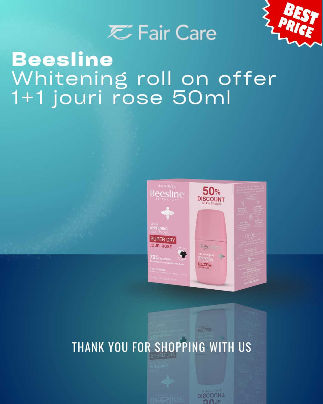 Beesline Whitening Roll-on Offer 1+1 Jouri Rose 50ml.. مفعول التركيبة المتطورة بالتفلوز وصمغ النحل وخلاصة ورد الجوري الساحر لتفتيح منطقة الإبط وتوحيد لون البشرة مع منح الجلد حماية فورية وتعطيراً فائقاً وحماية ممتدة ضد الروائح الكريهة ومنح الإبط مظهراً نقياً وأكثر نعومة وجاذبية بفعالية