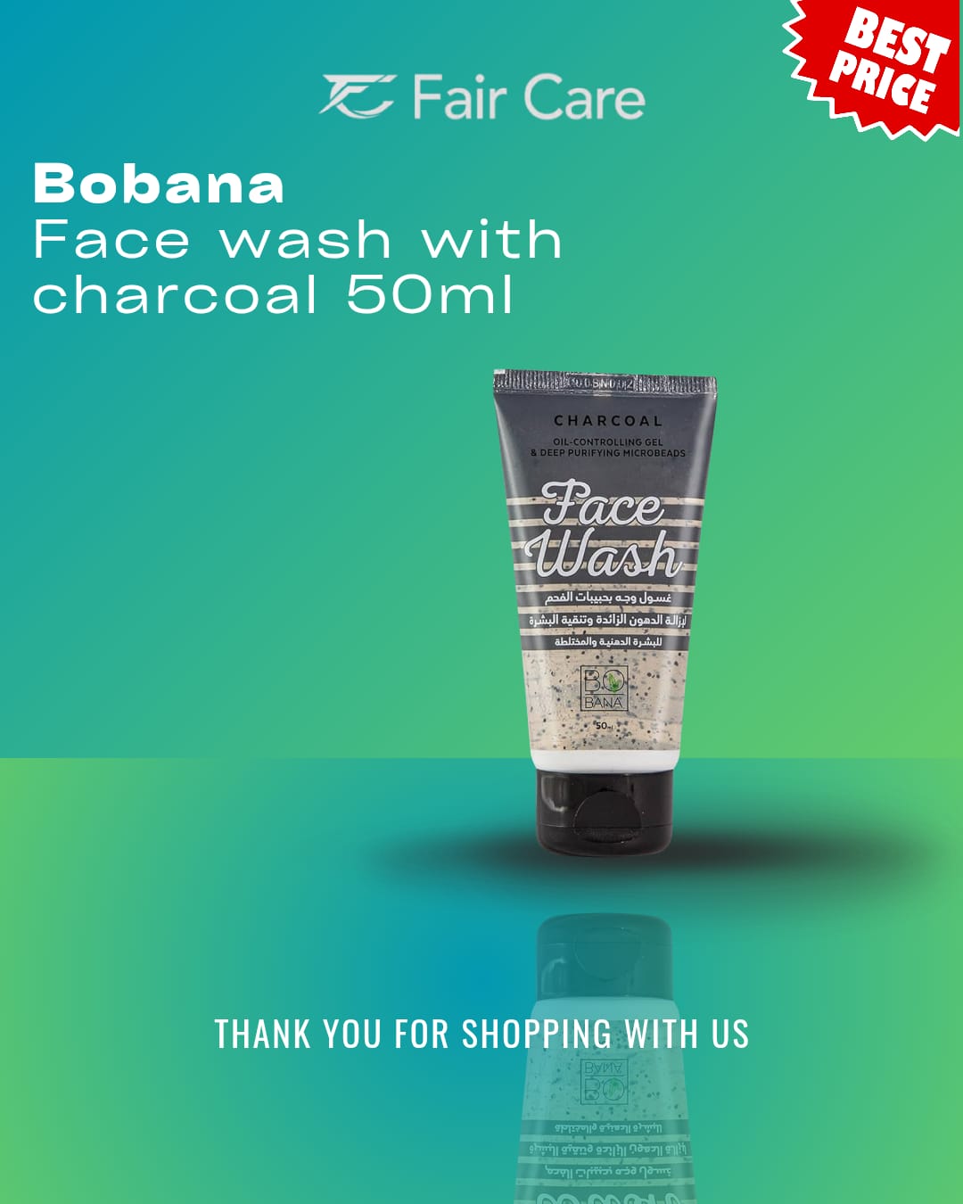 Bobana Charcoal Face Wash Black 50ml.. مفعول التركيبة المنقية بخلاصة الفحم النشط لامتصاص الدهون الزائدة وإزالة الرؤوس السوداء مع منح البشرة تنظيفاً عميقاً ونعومة فائقة وحماية ممتدة ضد الشوائب ومنح الوجه ملمساً نقياً ومظهراً مطفياً وأكثر صفاءً بفعالية