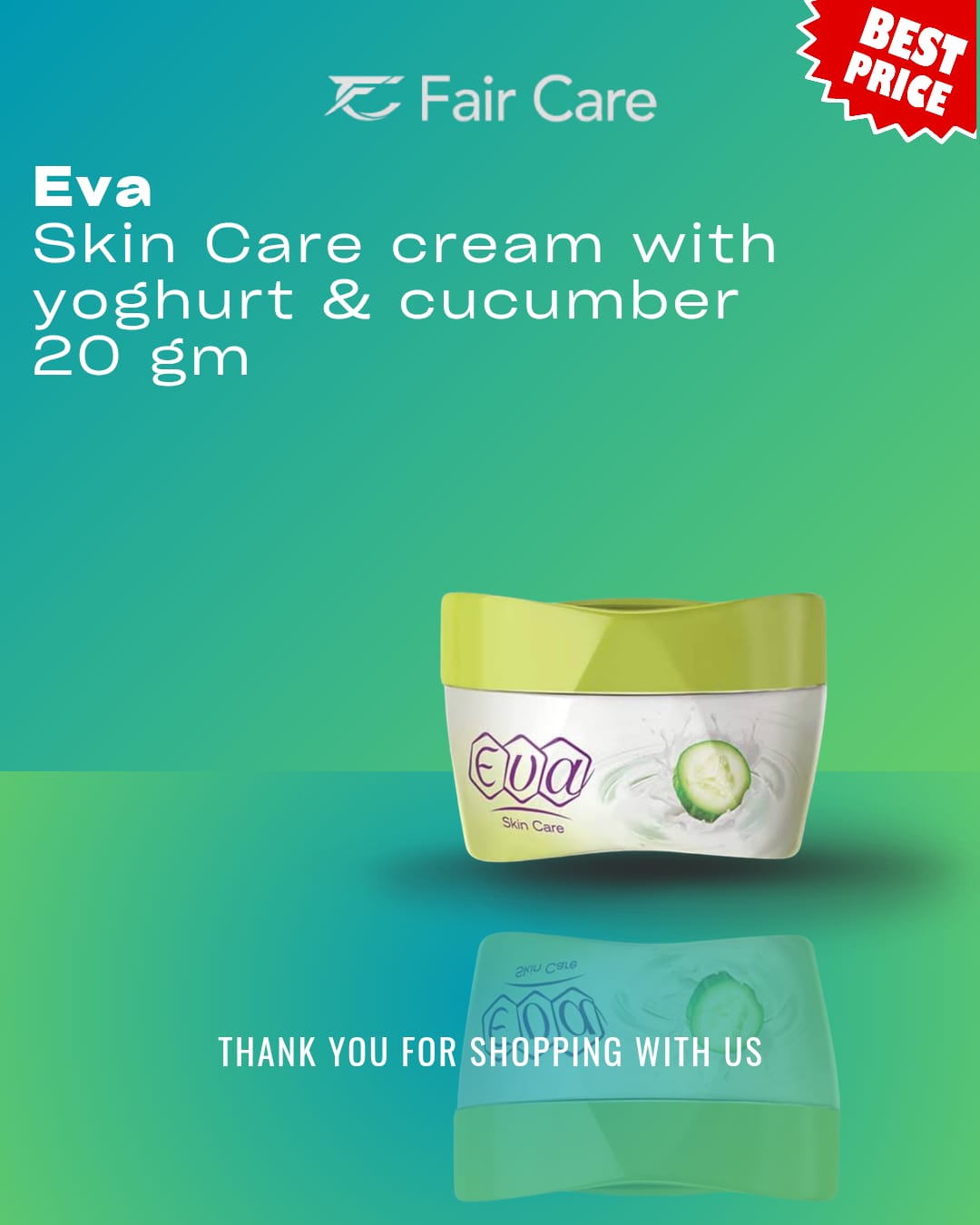 Eva Yoghurt & Cucumber Cream 20g.. مفعول خلاصة الزبادي المنقية والخيار الملطف لموازنة إفرازات الدهون وترطيب البشرة دون ثقل مع منح الوجه انتعاشاً فورياً بفعالية