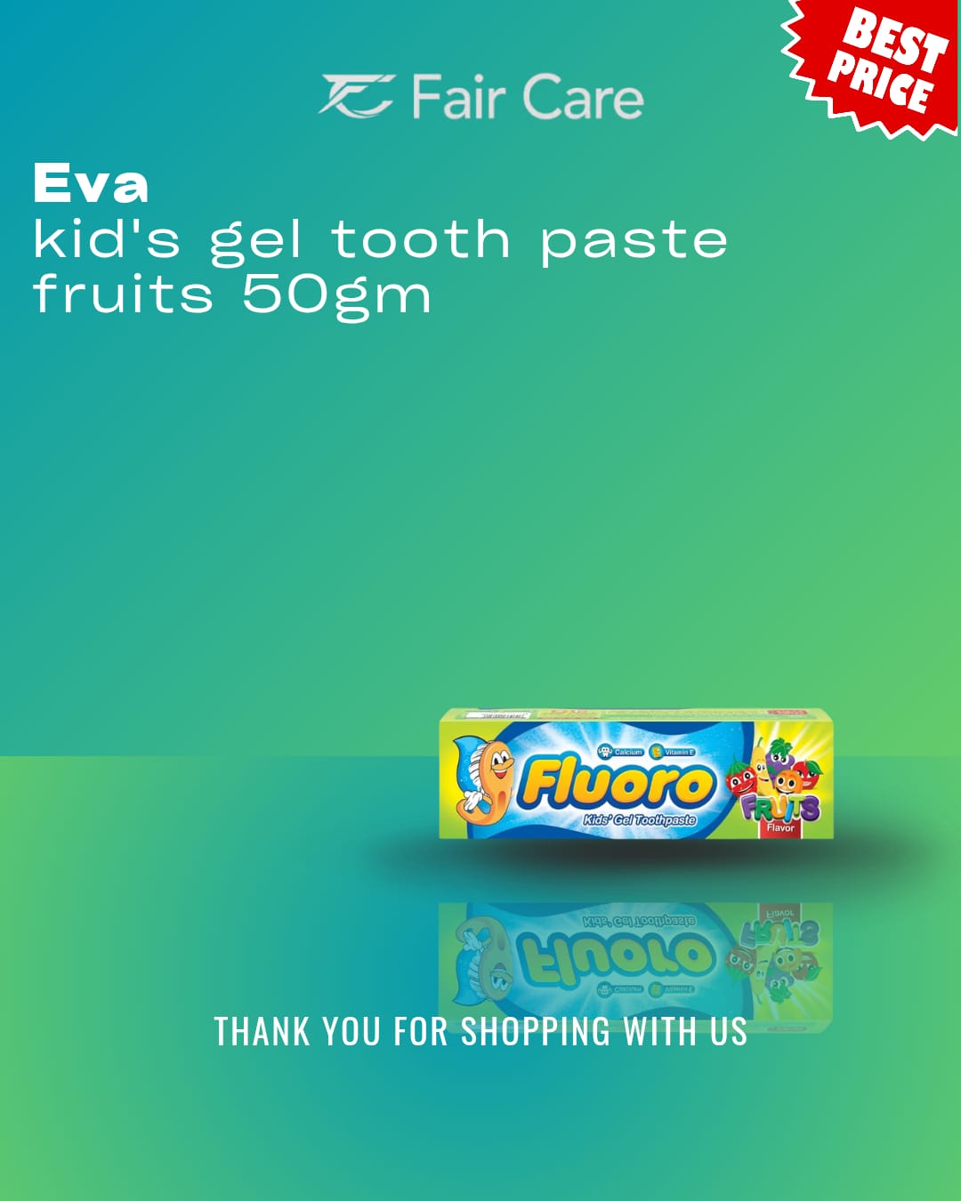 Fluoro Eva Toothpaste With Fruits 50g.. مفعول الفلورايد النشط لتقوية طبقة المينا وحماية الأسنان من التسوس مع تنظيف الفم بلطف ومنحه نفساً منعشاً بطعم الفواكه الرائع ومظهراً صحياً بفعالية
