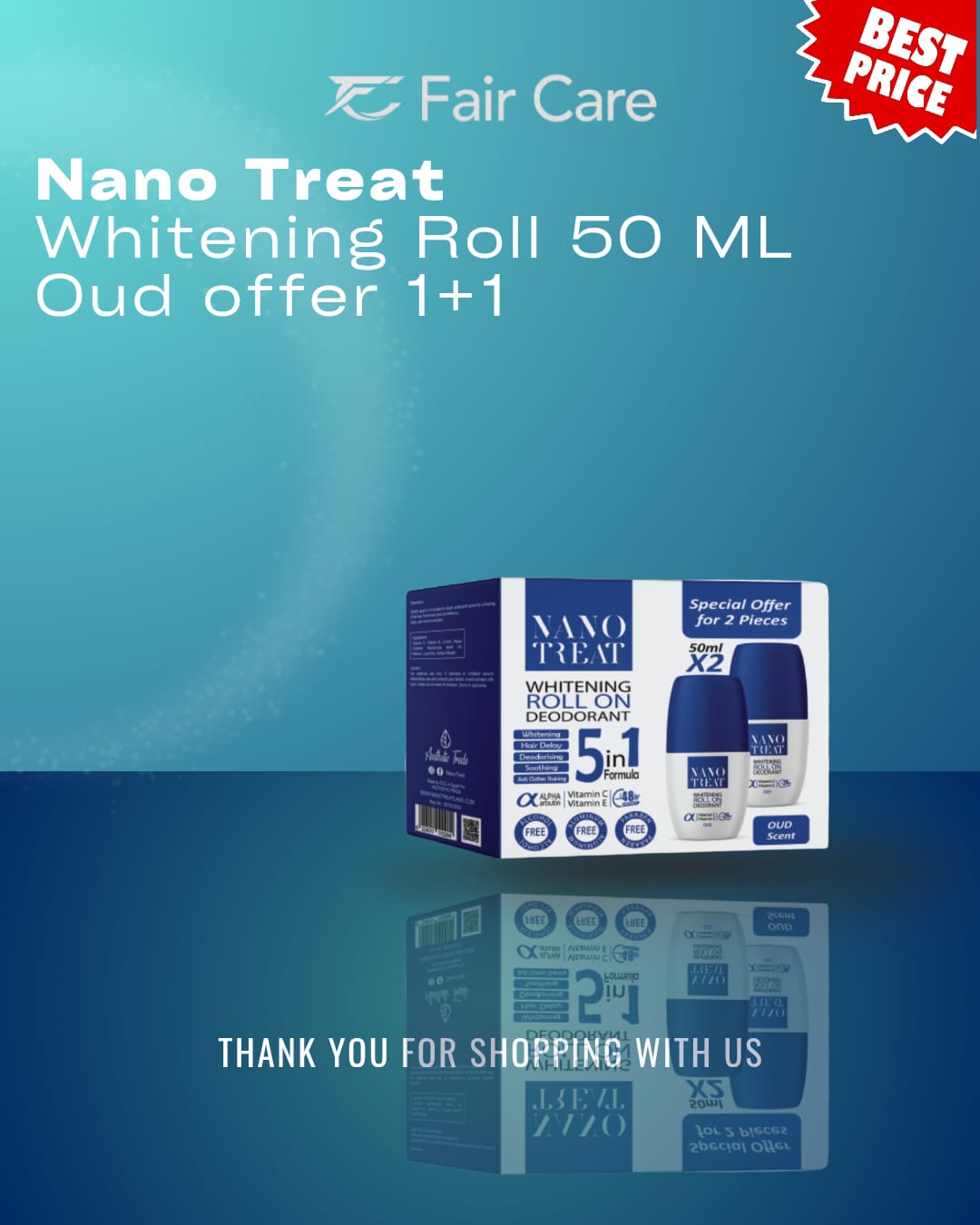 يعد نانوتريت رول أون العود المفتح وبعبوة الخمسين ملليتراً الذكية وفي عرض القطعتين الموفر الخيار الأكثر ذكاءً وإنقاذاً لكل من تعاني من اسمرار منطقة الإبطين وتبحث عن منتج يجمع بين قوة التفتيح العلاجي والرائحة الشرقية المهيبة التي تبرز حضورها بفعالية كبيرة وتتميز تركيبته المبتكرة والفريدة بقدرتها العالية على النفاذ لطبقات الجلد بفضل تقنية النانو التي تعمل ببراعة على تفتيح البقع الداكنة ومنح الجلد ملمساً فاتحاً وموحداً بفعالية مذهلة وبفضل كونه غنياً برائحة العود العربي الفاخرة، تساعدكِ هذه التركيبة على حماية انتعاشكِ الشخصي ومنح بشرتكِ ملمساً ناعماً، مما يمنحكِ شعوراً بالثقة والنظافة والمظهر المتألق من اللمسة الأولى وبكل رقة واحترافية تناسب روتين العناية اليومي بجمال وبياض بشرتكِ