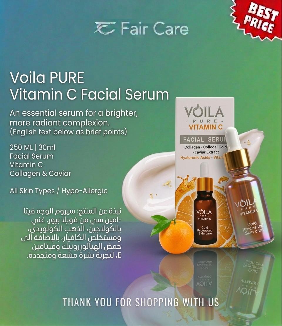 VOILA Pure Vitamin C Facial Serum.. مفعول التركيبة الغنية والمتطورة بفيتامين سي المستقر وحمض الهيالورونيك وفيتامين هـ لتعزيز كولاجين البشرة بعمق وتفتيح التصبغات برقة مع منح الوجه نضارة فورية ونعومة فائقة وحماية ممتدة ضد الأكسدة ومنح الجلد مظهراً نقياً وأكثر إشراقاً وصفاءً بفعالية