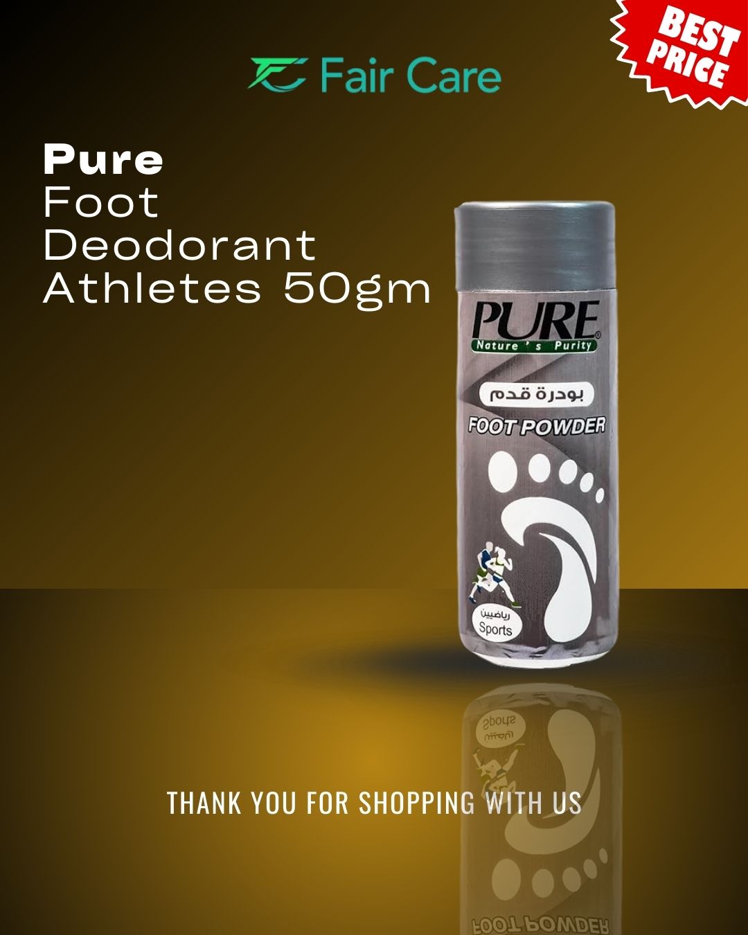 يعد بيور مزيل رائحة القدم للرياضيين وبعبوة الخمسين جراماً العملية والذكية الخيار الأكثر ذكاءً وإنقاذاً لكل من يعاني من كثرة التعرق نتيجة ارتداء الأحذية الرياضية لفترات طويلة ويبحث عن منتج يجمع بين القضاء على مسببات الرائحة والحفاظ على صحة الجلد بفعالية كبيرة وتتميز تركيبته المبتكرة والفريدة بقدرتها العالية على امتصاص العرق الزائد بفضل جودة المكونات التي تحتوي على عناصر نشطة تعمل ببراعة على تقليل نمو الفطريات المسببة للحكة بفعالية مذهلة وبفضل كونه مسحوقاً ناعماً وسلس الامتصاص، تساعدكِ هذه التركيبة على حماية منطقة ما بين الأصابع ومنح قدميكِ ملمساً جافاً، مما يمنحكِ شعوراً بالثقة والنظافة والمظهر المتألق من اللمسة الأولى وبكل رقة واحترافية تناسب روتين العناية اليومي بنظافة وراحة قدميكِ