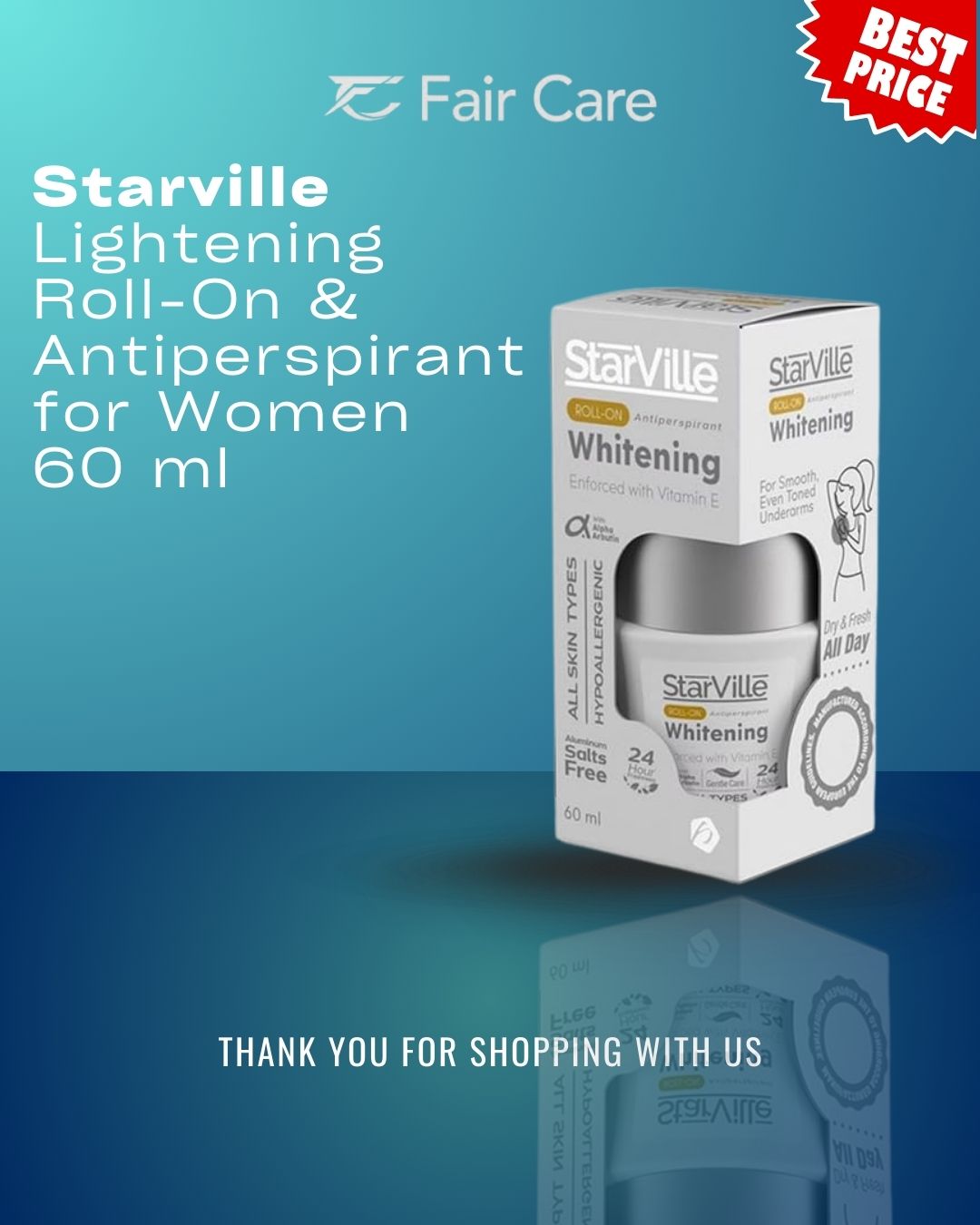 Starville Lightening Roll on & Antiperspirant 60ml.. مفعول التركيبة المفتحة المتطورة بخلاصة العرقسوس وفيتامين C وعناصر مهدئة لتقليل التصبغات ومنع رائحة العرق مع منح الإبطين نضارة فورية ونعومة فائقة وحماية ممتدة ضد الرطوبة ومنح الجسم مظهراً نقياً وأكثر بياضاً وصفاءً بفعالية